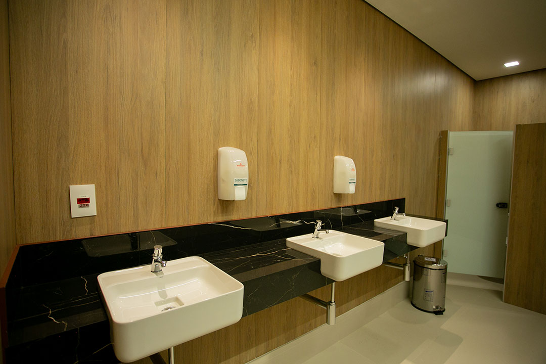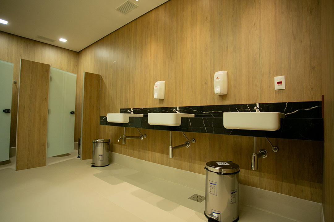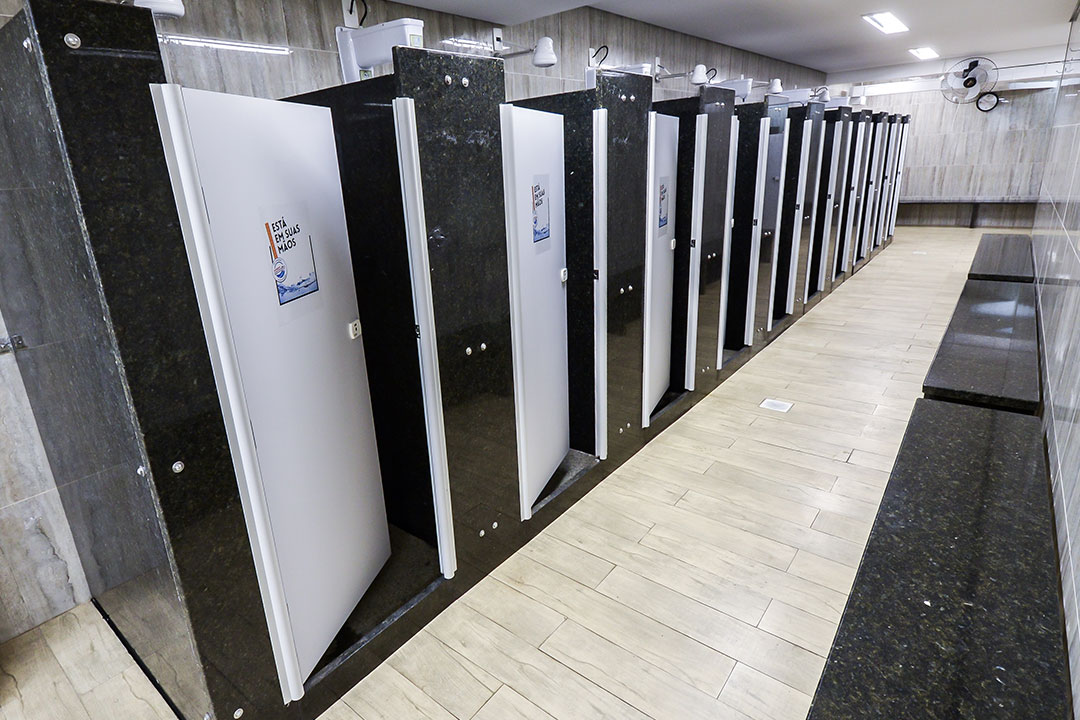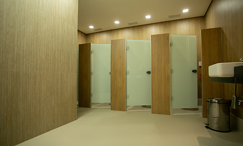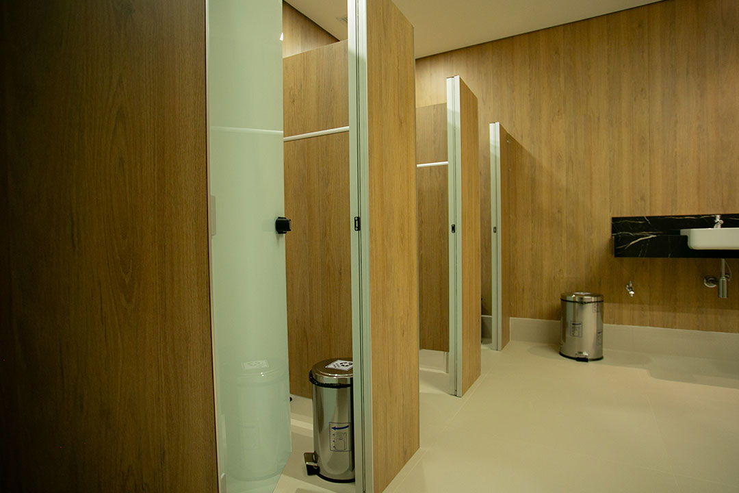 Boxes sanitários produzidos com materiais à prova d’água, tendo como principal componente o laminado estrutural/TS, além de perfis estruturais de alumínio e ferragens exclusivas do sistema que permitem sua utilização sem restrições em áreas molhadas como vestiários e sanitários, mesmo em boxes de chuveiro.