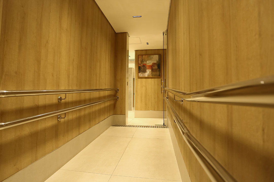 Leveza visual devido seu sistema autoportante que dispensa a utilização de travamentos horizontais. Sistema composto de montantes estruturais de alumínio fixados rigidamente ao piso e painéis em laminado estrutural TS (fórmica maciça), fixados nas paredes com fixações especiais, garantindo alta durabilidade.